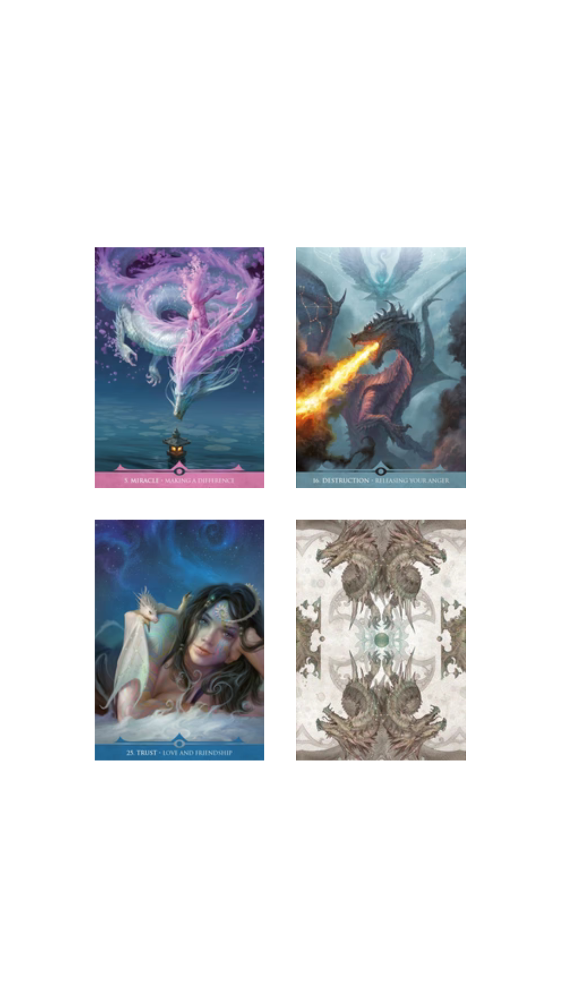 Star Dragons Oracle špil je koji se temelji na moćnim, mističnim bićima – zvjezdanim zmajevima. Sastoji se od 33 karte koje prikazuju zmajeve povezane s različitim aspektima svemira, univerzalne energije i unutarnje mudrosti. Karte donose poruke o transformaciji, snazi i duhovnom vođstvu, koristeći simboliku zmajeva koji predstavljaju moć, zaštitu, intuiciju i prosvjetljenje. Špil je idealan za one koji traže nadahnuće, duhovnu podršku i smjernice u suočavanju s izazovima, kao i za one koji žele ući u dublje, mističnije sfere svemira. Prateći vodič pruža tumačenja za svaku kartu i nudi smjernice za dublje razumijevanje poruka koje zmajevi donose.